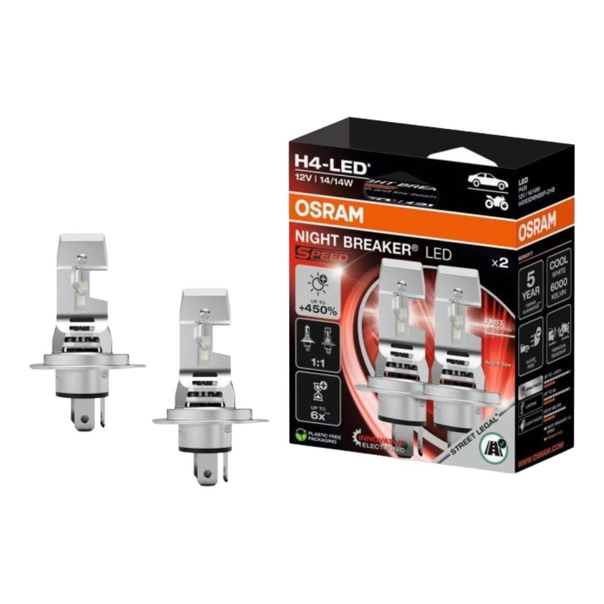 Homologizované LED žiarovky H4 Night Breaker Speed +450%12v 16W 64193DWNB s teplotou svetla 6000 kelvinov od nemeckej značky Osram