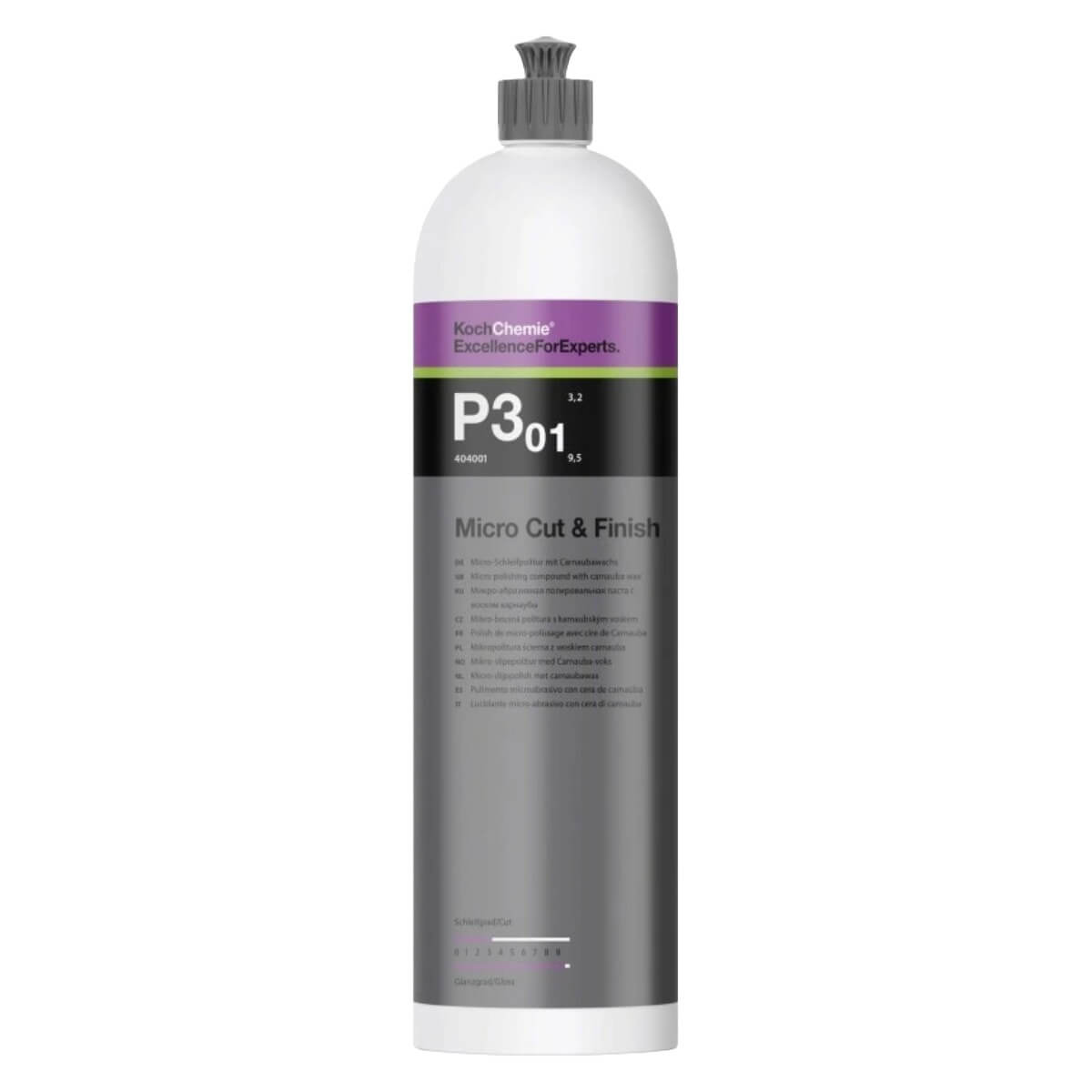 Leštiaca pasta s vysokým leskom s karnaubským voskom Micro Cut & Finish P3.01 na ľahké odstránenie škrabancov v 250ml balení alebo v litrovom balení od značky Koch Chemie