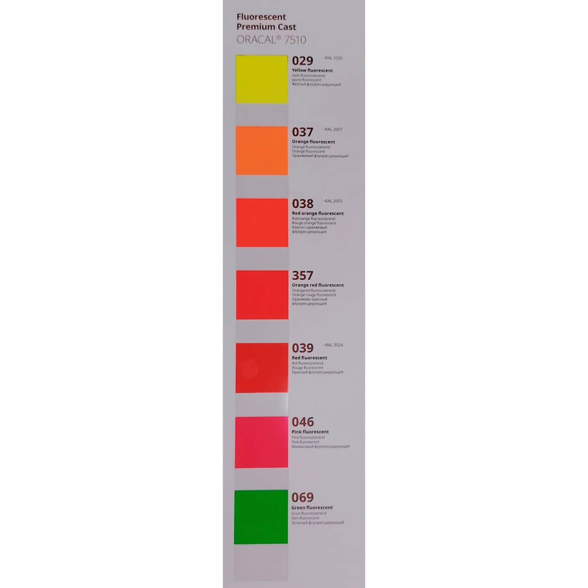 ORACAL® 7510 je vysokovýkonná fluorescenčná PVC fólia určená pre vonkajšie aplikácie, kde je potrebná maximálna viditeľnosť. Ideálna na výstražné značenia, reklamu vozidiel a autobusov či grafiku s krátkodobou trvácnosťou. K dispozícii je v 7 jasných fluorescenčných farbách a šírke 126 cm.