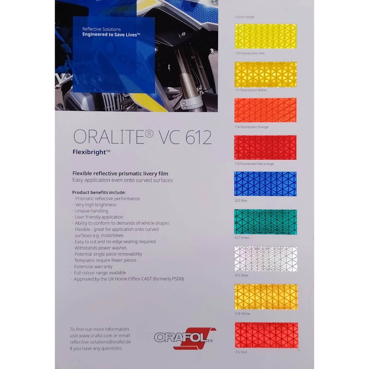 ORALITE® VC 612 Flexibright™ je vysoko odolný reflexný materiál určený na označovanie vozidiel pohotovostných služieb. Vyniká dlhou životnosťou, jednoduchou aplikáciou na lakované aj nelakované povrchy a možnosťou ľahkého odstránenia bez poškodenia podkladu.